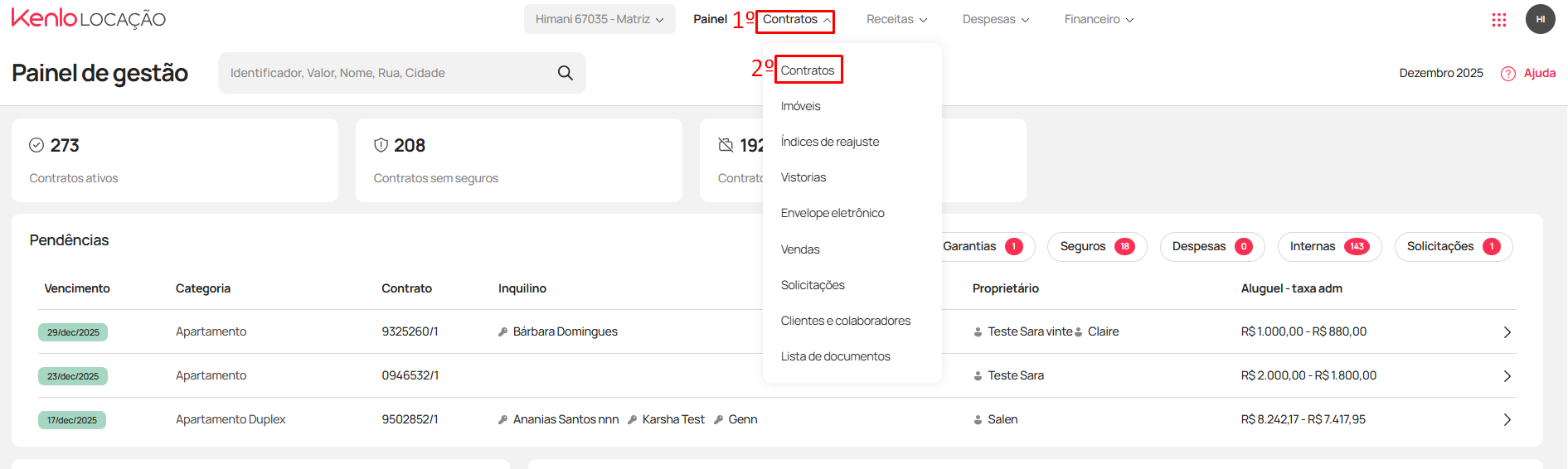 - Acesse o menu "Contratos" (1) > "Contratos" (2)