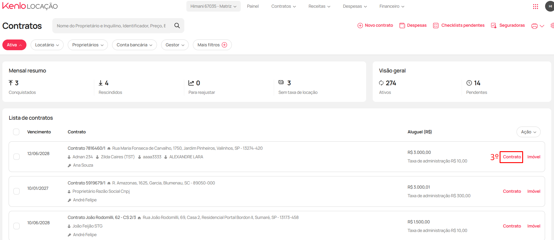 - Acesse a lista de contratos e localize o contrato que deseja pausar clique em Contrato (3)