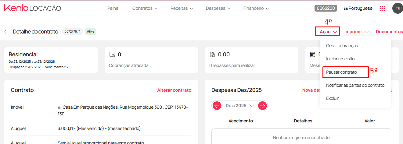 - Na tela clique em "Ação" (4) e depois em "Pausar contrato" (5)