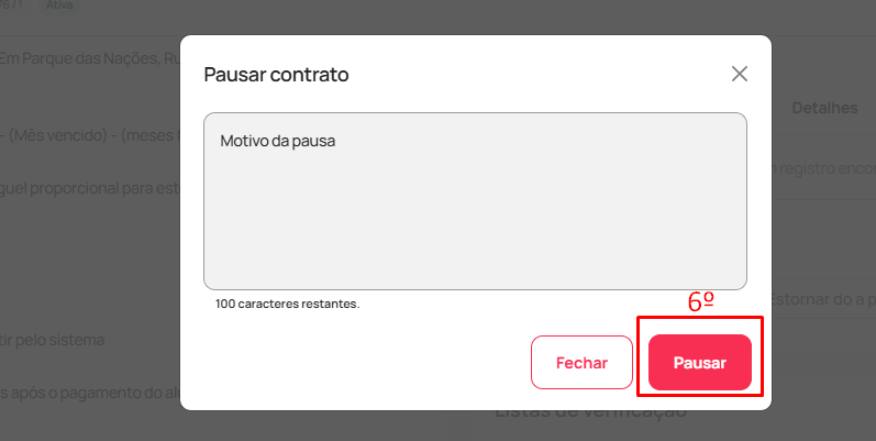 - Insira o motivo da pausa e selecione "Pausar" (6)