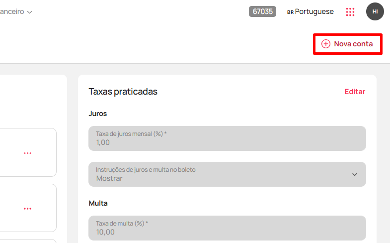 Ao lado direito da tela, clique em "Nova Conta Bancária"