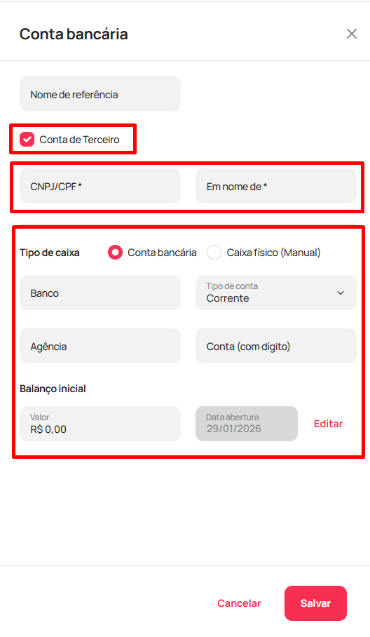 A opção “Conta de terceiro” deve ser marcada sempre que a conta bancária utilizada para o recebimento dos valores não pertencer ao CPF/CNPJ cadastrado em Dados da empresa.