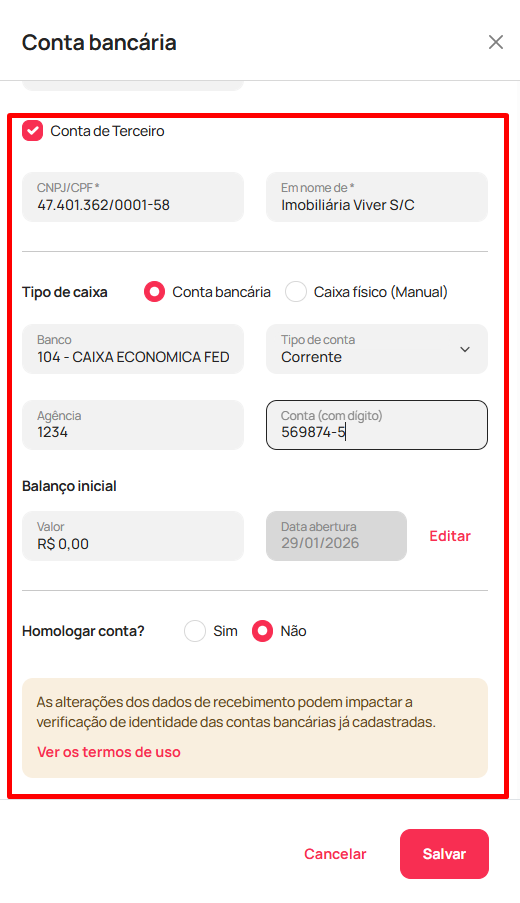 Ao habilitar a opção “Conta de terceiro”, a imobiliária deverá preencher os seguintes campos: