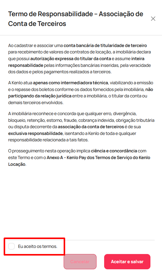 Após preencher corretamente as informações e salvar, o sistema irá pedir o aceite ao Termo de Responsabilidade ao Uso da Conta de Terceiro:6. Com o aceite, a conta de terceiro será cadastrada com sucesso no sistema e passará a aparecer como uma nova forma de recebimento vinculada à empresa. Essa forma de recebimento poderá ser habilitada para o crédito dos valores enviados pelo Kenlo Pay.