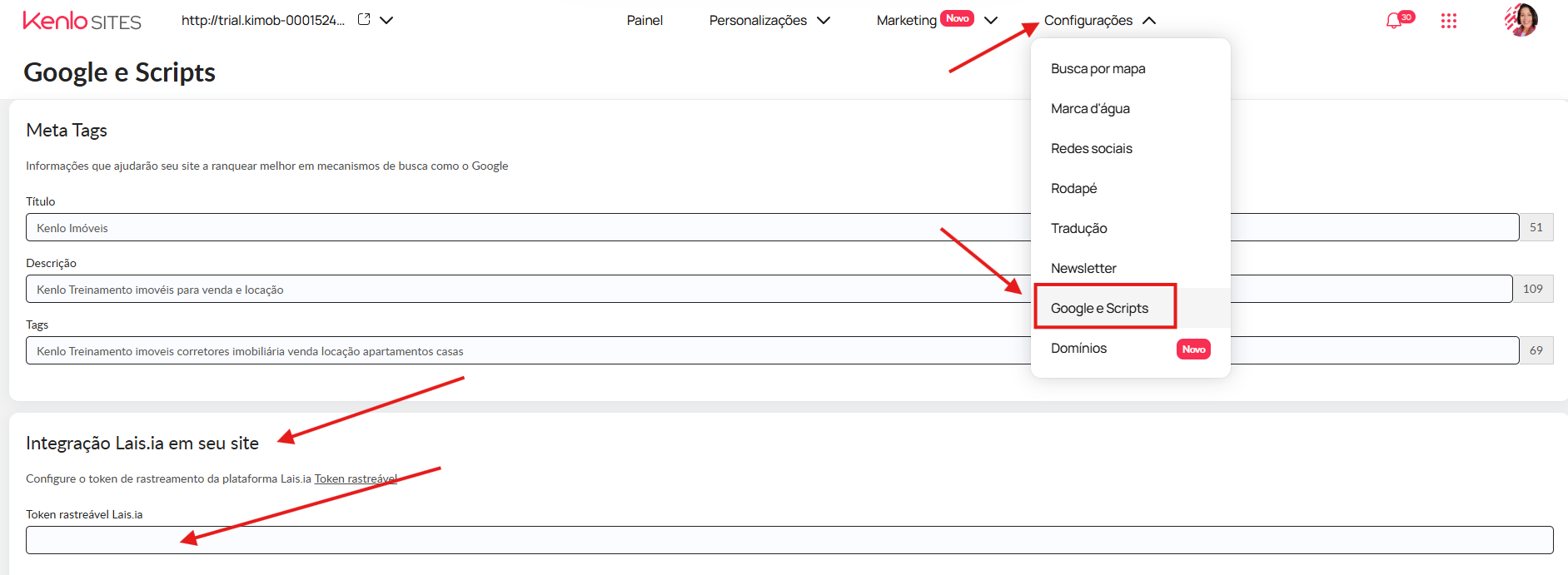 Com essa configuração, todos os contatos recebidos no site serão enviados automaticamente para a Lais antes de entrarem no sistema Kenlo Imob, garantindo um atendimento inicial mais rápido e eficiente. Para isso você vai precisar de um token disponibilizado pela Lais.